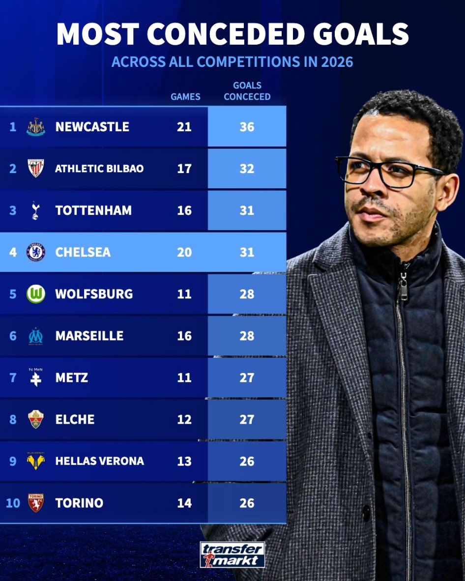 北京时间3月18日,切尔西在欧冠1/8决赛次回合的比赛中主场0-3完败于巴黎圣日耳曼,两回合总比分2-8被淘汰出局。与此同时,根据德转的统计,蓝军2026年各项赛事的丢球数已经达到了31球,同期欧洲五大联赛球队并列第三多,与近况糟糕的热刺相同。
